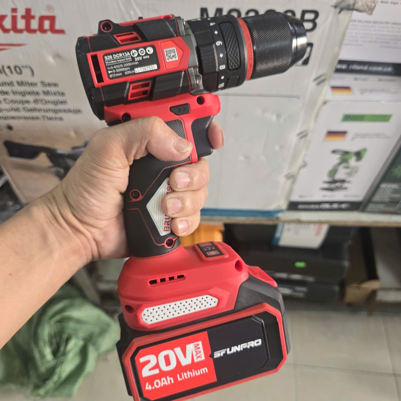 máy khoan vặn vít pin, máy khoan pin 20V, SFUNPRO S20 DCR13A, máy khoan 13mm, máy vặn vít pin nhỏ gọn, máy khoan gia đình, dụng cụ sửa chữa cầm tay, máy khoan pin không chổi than