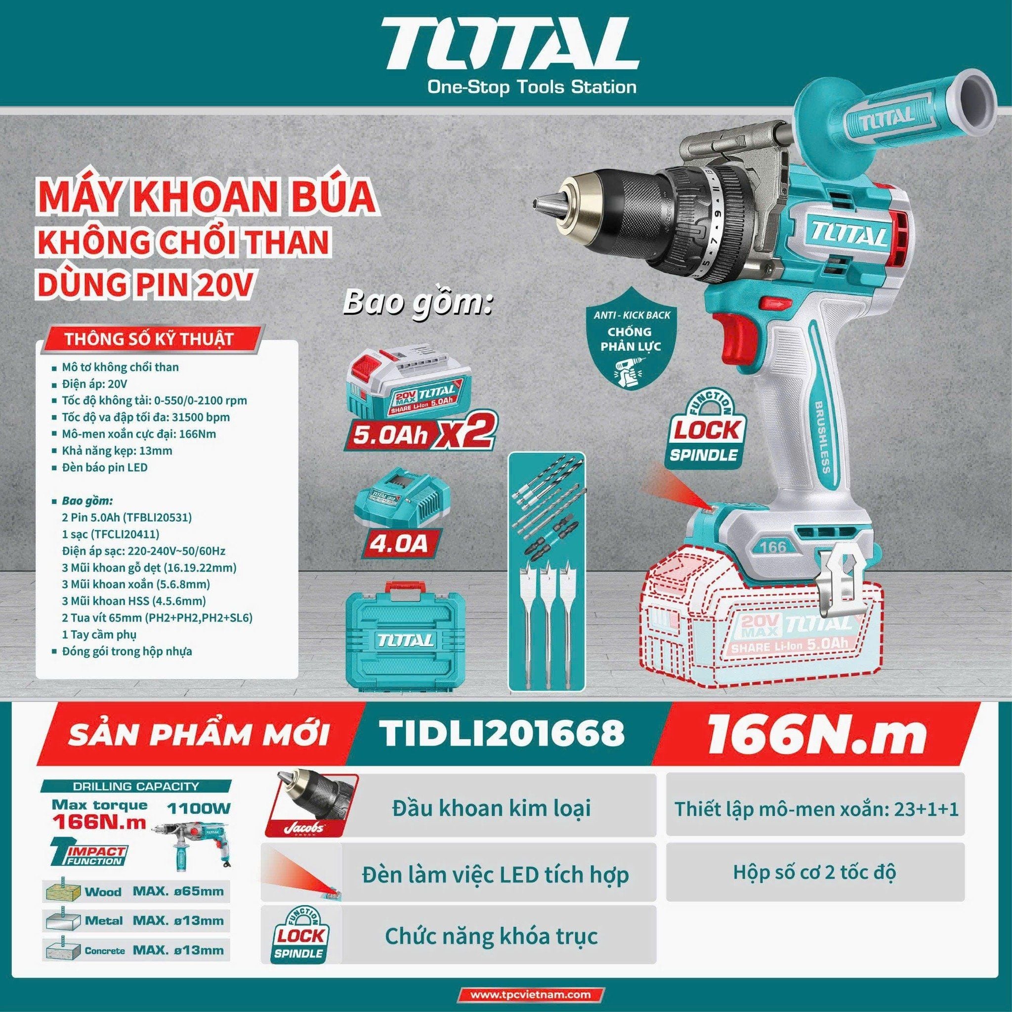 Máy khoan búa TOTAL TIDL1201668 là dòng sản phẩm cao cấp thế hệ mới được trang bị động cơ không chổi than (Brushless) giúp tăng tuổi thọ gấp đôi, hoạt động mạnh mẽ và ổn định hơn so với các dòng máy truyền thống. Với mô-men xoắn cực đại lên đến 166N.m, sản phẩm này hoàn hảo cho mọi nhu cầu khoan và bắt vít trong gỗ, kim loại, bê tông, hoặc công trình dân dụng.