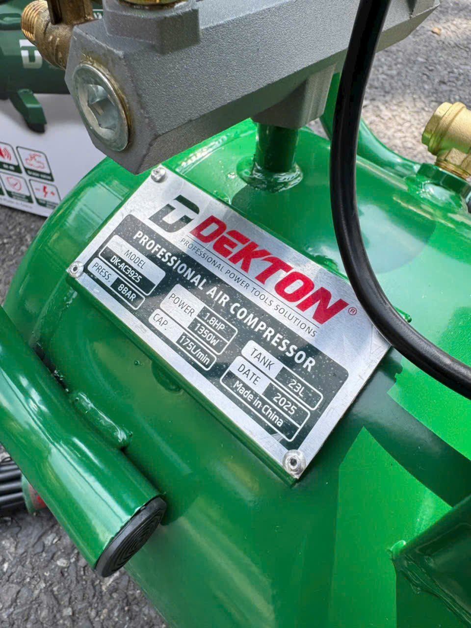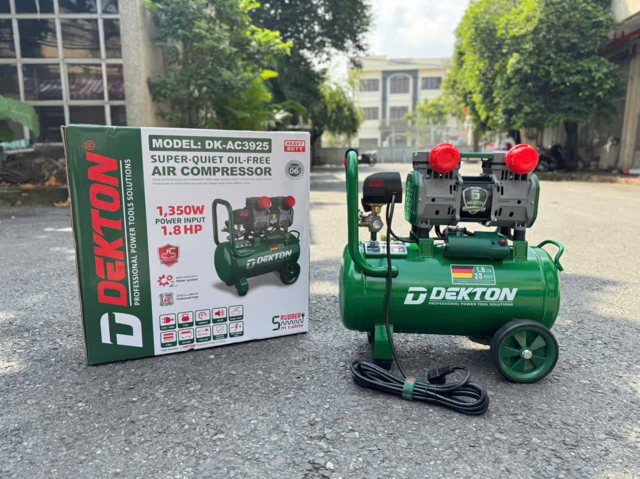Khi bạn cần một giải pháp khí nén mạnh mẽ, sạch và vận hành linh hoạt — Máy nén khí không dầu DEKTON DK‑AC3925 là lựa chọn rất đáng cân nhắc. Với bình chứa 23 L, công suất 1.8 HP (1350 W), lưu lượng khí 175 L/phút và áp lực tối đa 8 bar, máy đáp ứng hiệu quả cho nhiều ứng dụng sửa chữa – cơ khí – phun sơn nhỏ tới vừa tại Việt Nam.